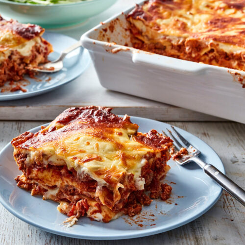 - Haal de lasagne uit de oven en verdeel in 6 stukken.